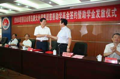 8月26日上午,胶南市慈善总会在市民政局五楼会议室举行青岛康大外贸集团慈善助学基金签约暨助学金发放仪式,并为我市100名贫困家庭的大学生发放了助学金。