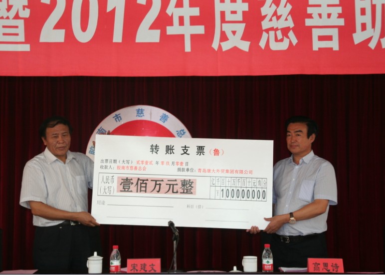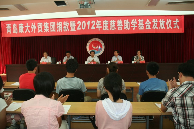 青岛康大外贸集团从成立之初就始终坚持“回馈社会、造福人民”的企业理念,积极承担企业的社会责任,捐资助学、援建校舍,并于2011年8月在市慈善总会建立了胶南市首个亿元慈善助学基金,让我市更多的贫困家庭学生实现了上学梦。(石南 马京奎)