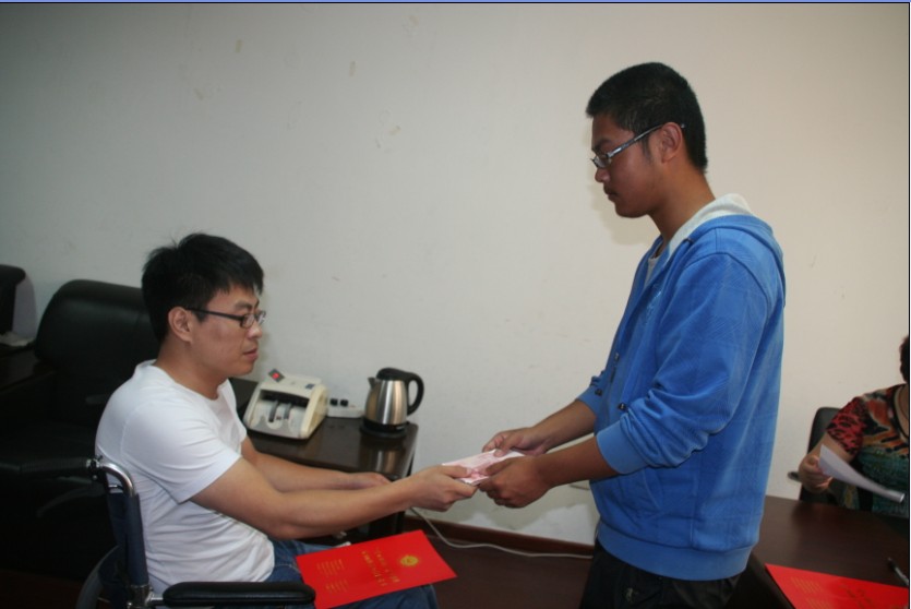8月15日上午9时,一位老人推着一名约30岁左右的残疾年轻人来到胶南市慈善总会,没等工作人员询问,轮椅上的年轻说道:“听说你们这里最近开展慈善助学活动,我想资助一名今年应届毕业,家庭困难的大一新生。”“他是一级伤残军人蔡池茂”老人介绍说。此时,在场的所有工作人员同时感动起立,肃然致敬。